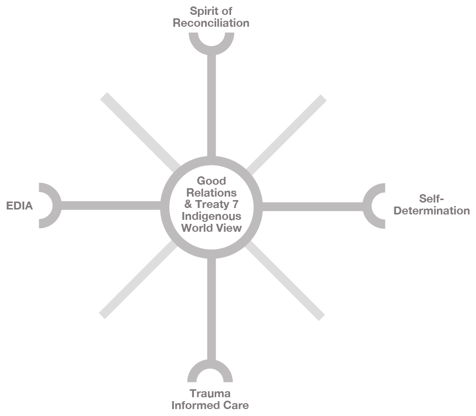 In 2023, we started developing this Good Relations framework, which also adopts a Treaty 7 Indigenous world view, as a guide to how we engage with one another and with community. This is a living document; a starting point that will be continuously updated and revised as needed.